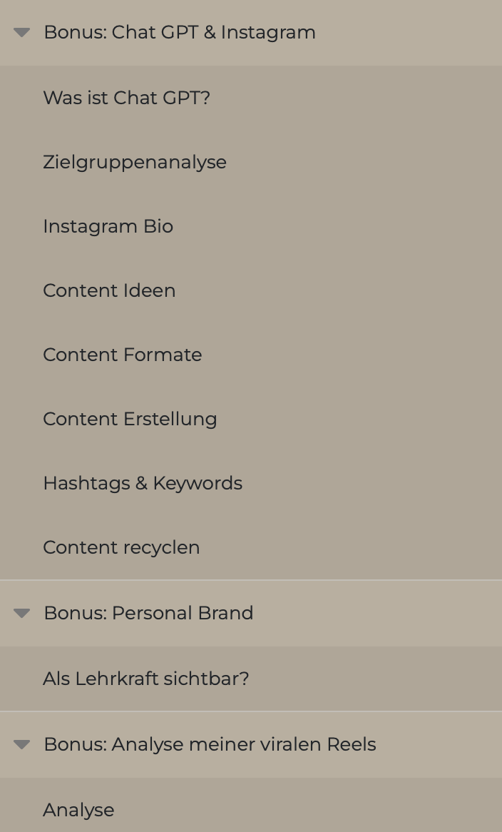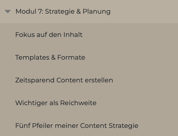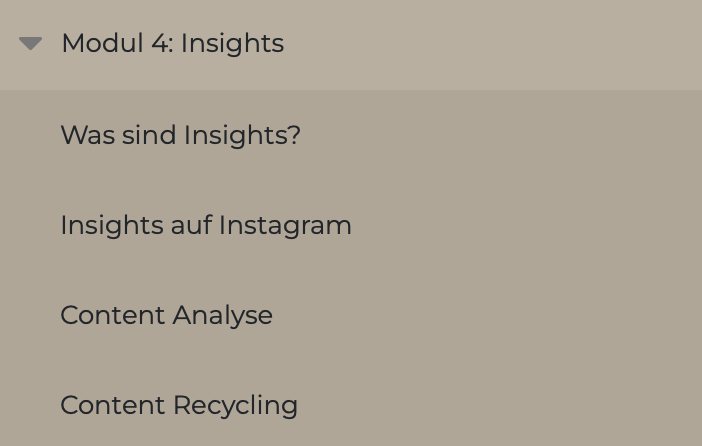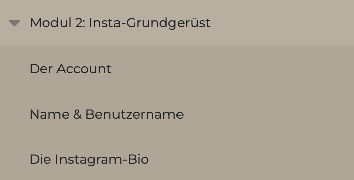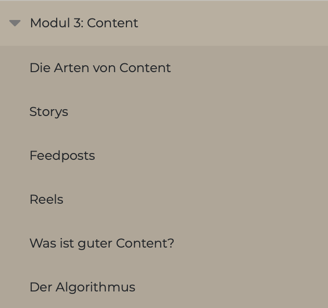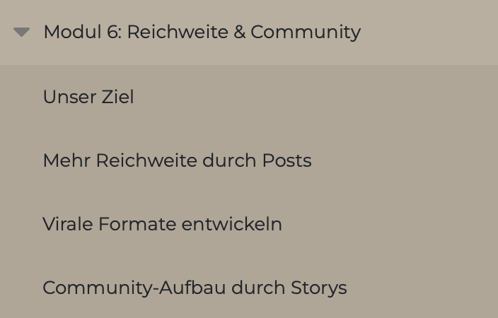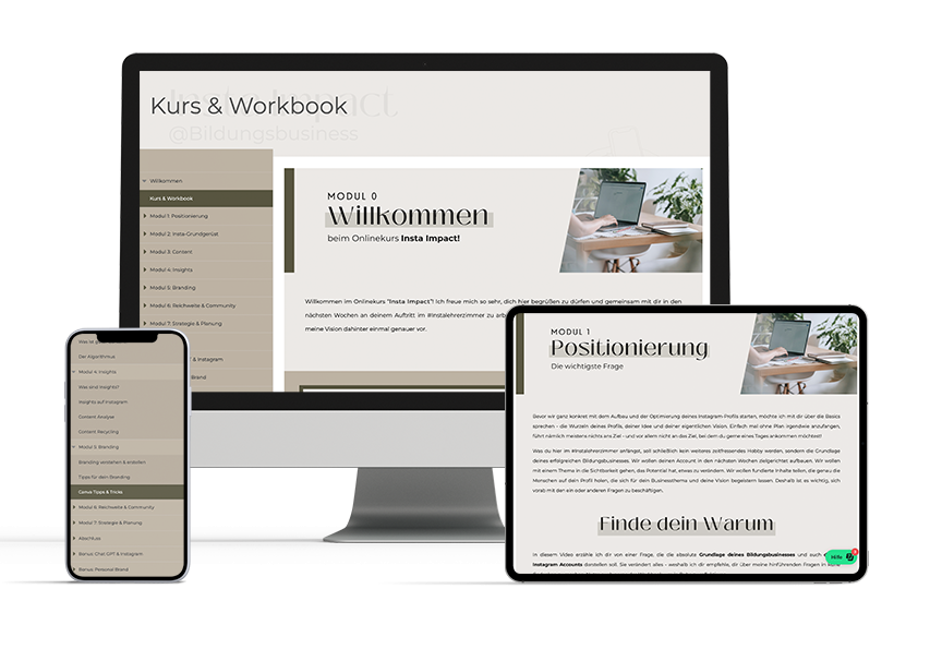 In 7 Modulen des Onlinekurses (+ drei Bonus-Modulen) erfährst du, wie du dir einen Account mit Reichweite aufbaust, welche Funktionen und Strategien du nutzen solltest und wie du aus der breiten Masse herausstichst. Im begleitenden Workbook vertiefst du dein erworbenes Wissen und wendest es durch die richtigen Fragen direkt auf dein Bildungsbusiness an.